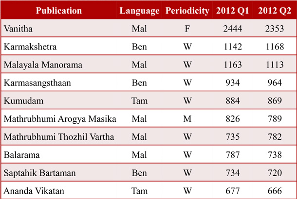 Only three language magazines – Karmakshetra, Karmasangsthaan and Mathrubhumi Thozhil Vartha – have registered growth in readership in this quarter. Vanitha continues to be the leader with an AIR of 2,353,000 in Q2, despite losing 91,000 readers from Q1.