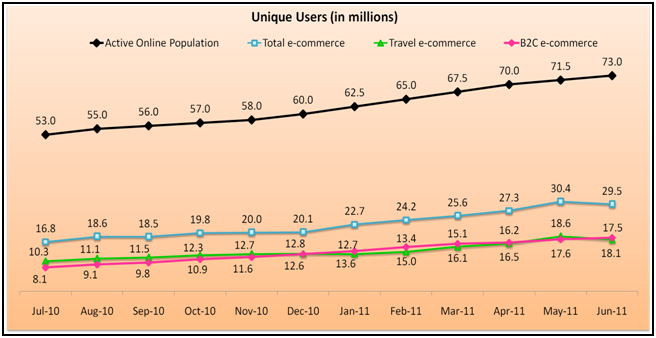 The report estimates the active Indian internet audience in June 2011 to be around 73 million, with around 29.5 million users involved in e-commerce. Audience involved in travel e-commerce is estimated to be around 18.1 million, while B2C e-commerce audience is estimated to be around 17.5 million unique users.