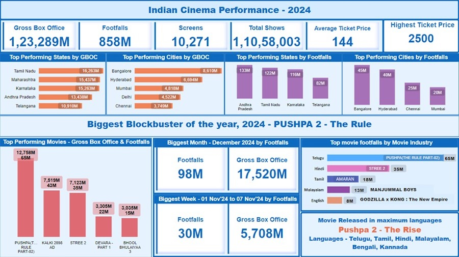 'Pushpa 2 (Telugu)' was the record-breaker movie of 2024. In its opening week, it earned INR 750 crores in box office collections and 3.43 crores in footfalls. Pushpa 2's total GBOC in 2024 stood at INR 1,269 crores, and it garnered 6.5 crore total footfalls. The movie was simultaneously released in multiple languages, including Hindi, in different parts of India.
