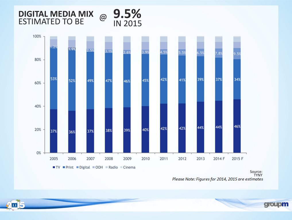 Digital media continues to show the maximum growth with 37 per cent in 2015. Digital has been growing at an average rate of 35 per cent over the last two of years. Within digital media, video, mobile and social will be the biggest growth drivers, mentions the report.