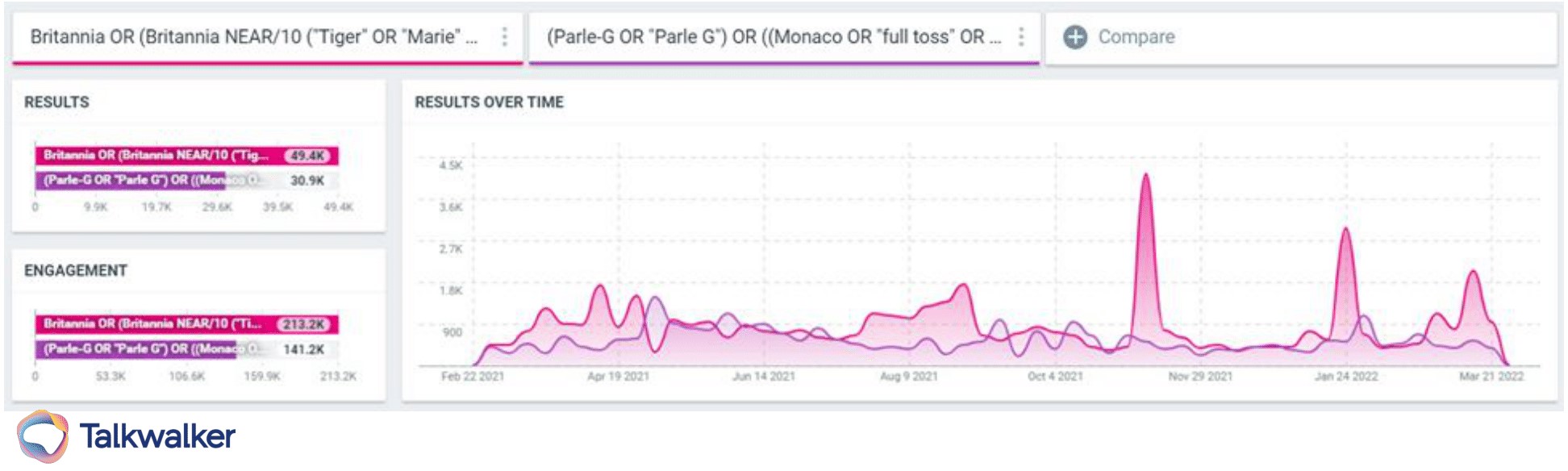 Mentions and engagements on food brands Britannia (pink) and Parle (purple), covering the past 13 months, from March 2021 to March 2022.