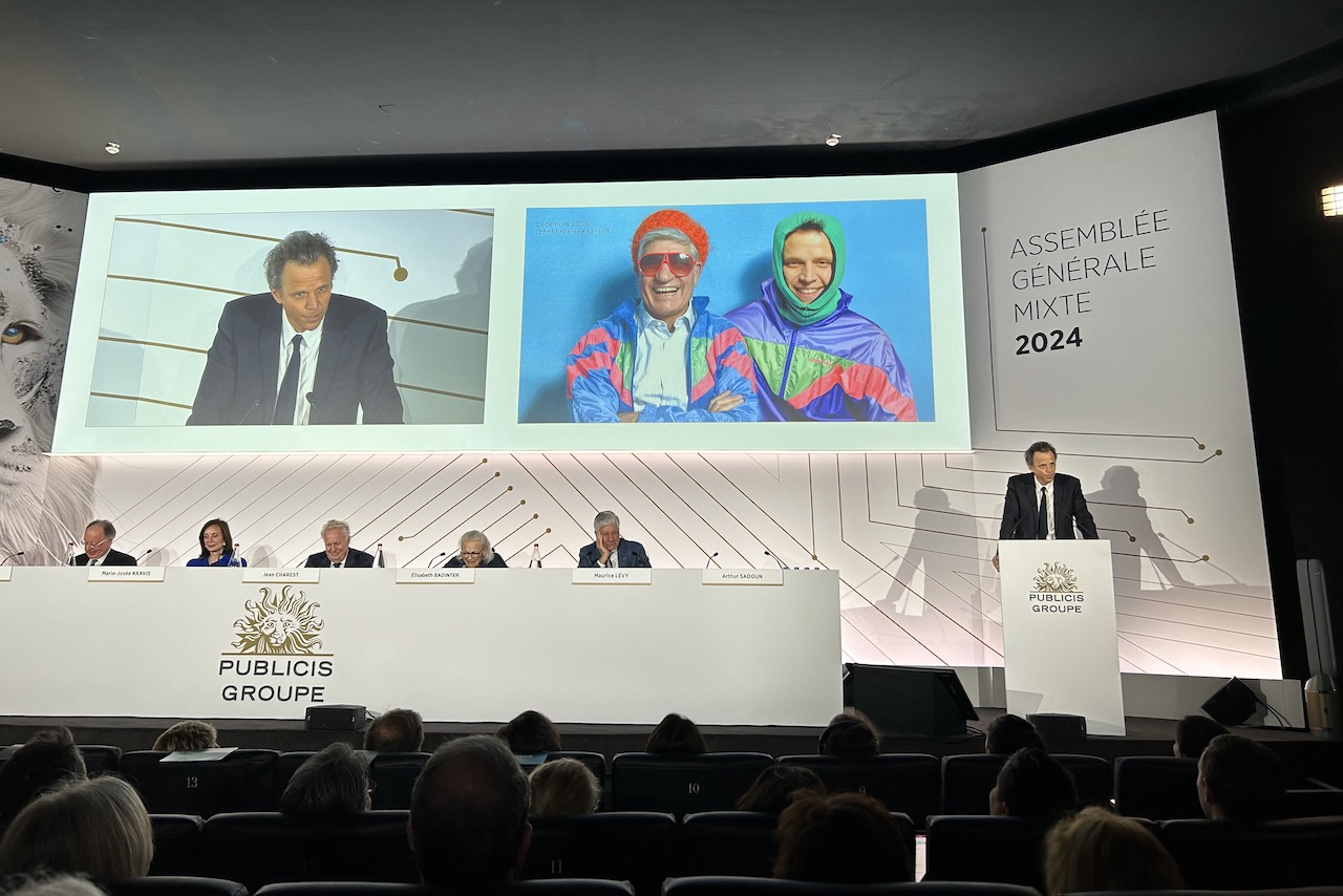 Ads for mainly French brands such as Orange, Renault, Lancôme, and Cartier played on the screen before the AGM began, and Sadoun praised Agathe Bousquet, the head of Publicis in France, in the front row.