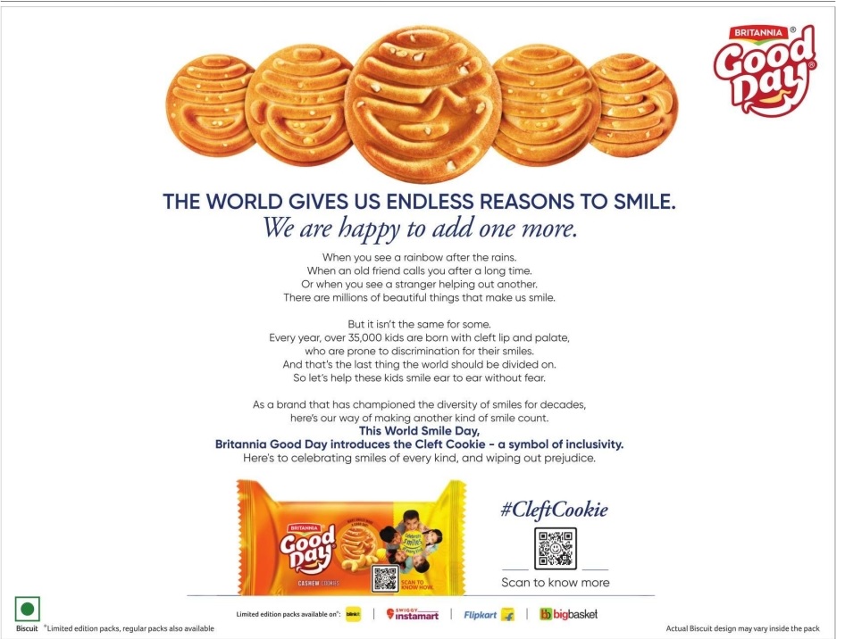 As a part of this campaign, Good Day has rolled out limited-edition packs, with a cookie featuring a cleft smile semblance. Through this, Britannia aims to educate people about cleft lip and palate. It wants to seek inclusivity for children with a facial difference. Each limited-edition pack features a QR code, which, when scanned, takes consumers to a website containing informing about cleft conditions.