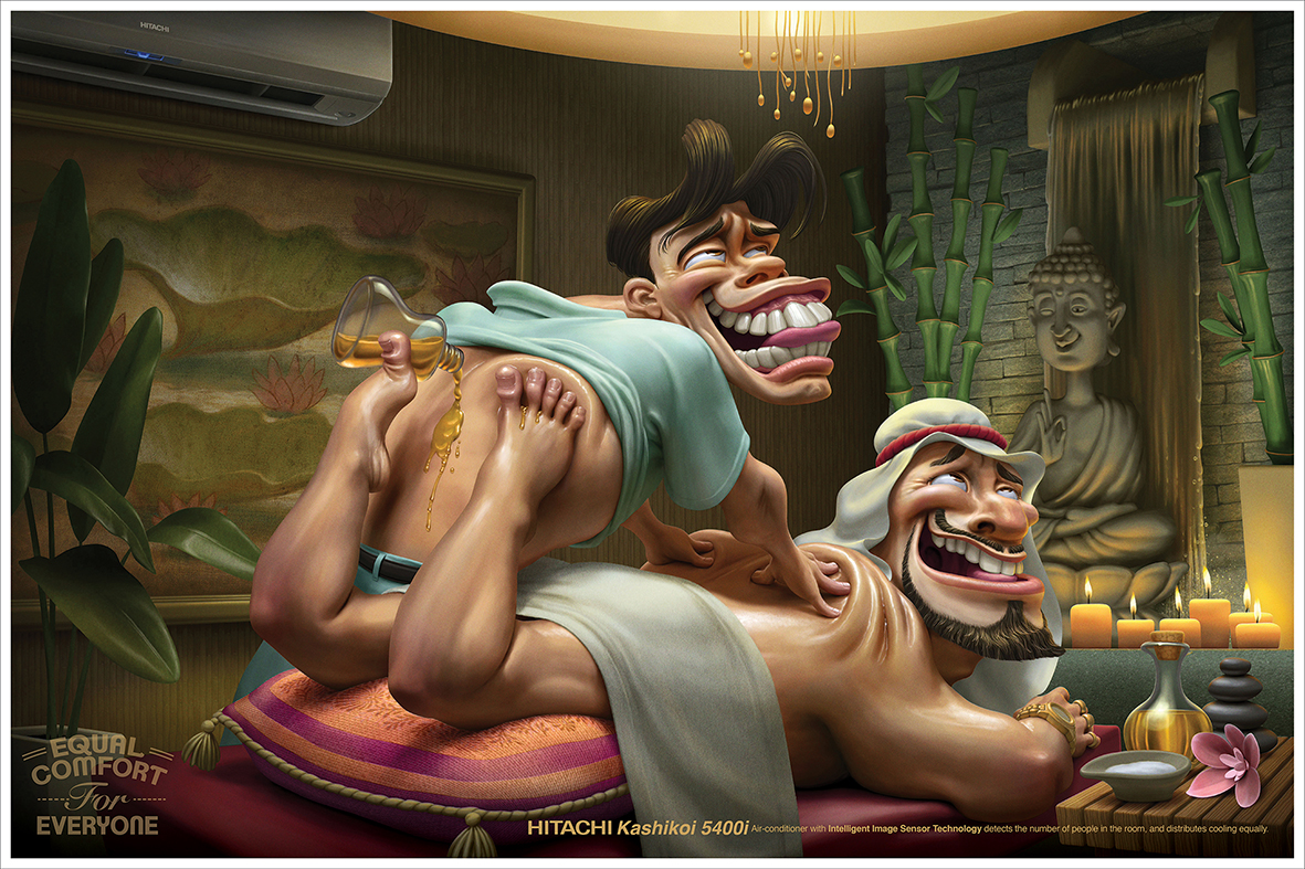 Hitachi Air Conditioners distribute equal cooling to all corners of the house/room. To drive home this message Dentsu Impact created a three-ad campaign bringing alive three everyday situations through illustrations. Quirkily illustrated, the campaign shows that both the head massager and his client, the foot massager and her client, and the body massager and his client are giving each other equal comfort.