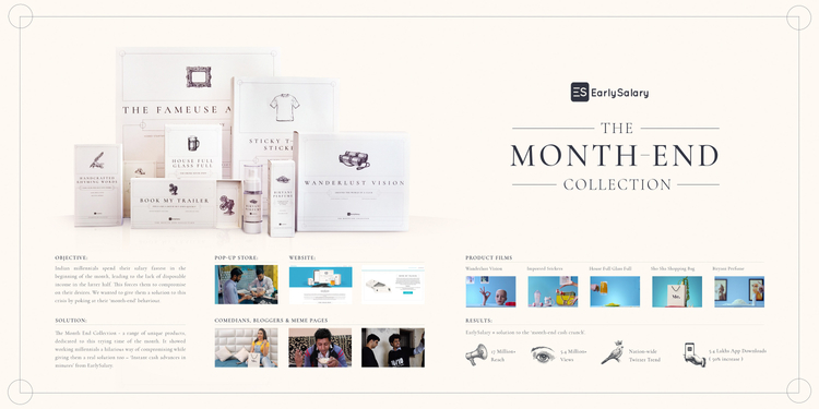 The Month-End Collection - a range of unique products was dedicated to our audience’s month-end behaviour of compromising. Real products along with product films were crafted and packaged to poke fun at them. The audience was provoked into feeling that the products were a new way to compromise. But once they were lured, they were provided with the perfect solution to month-end cash woes - the EarlySalary app.