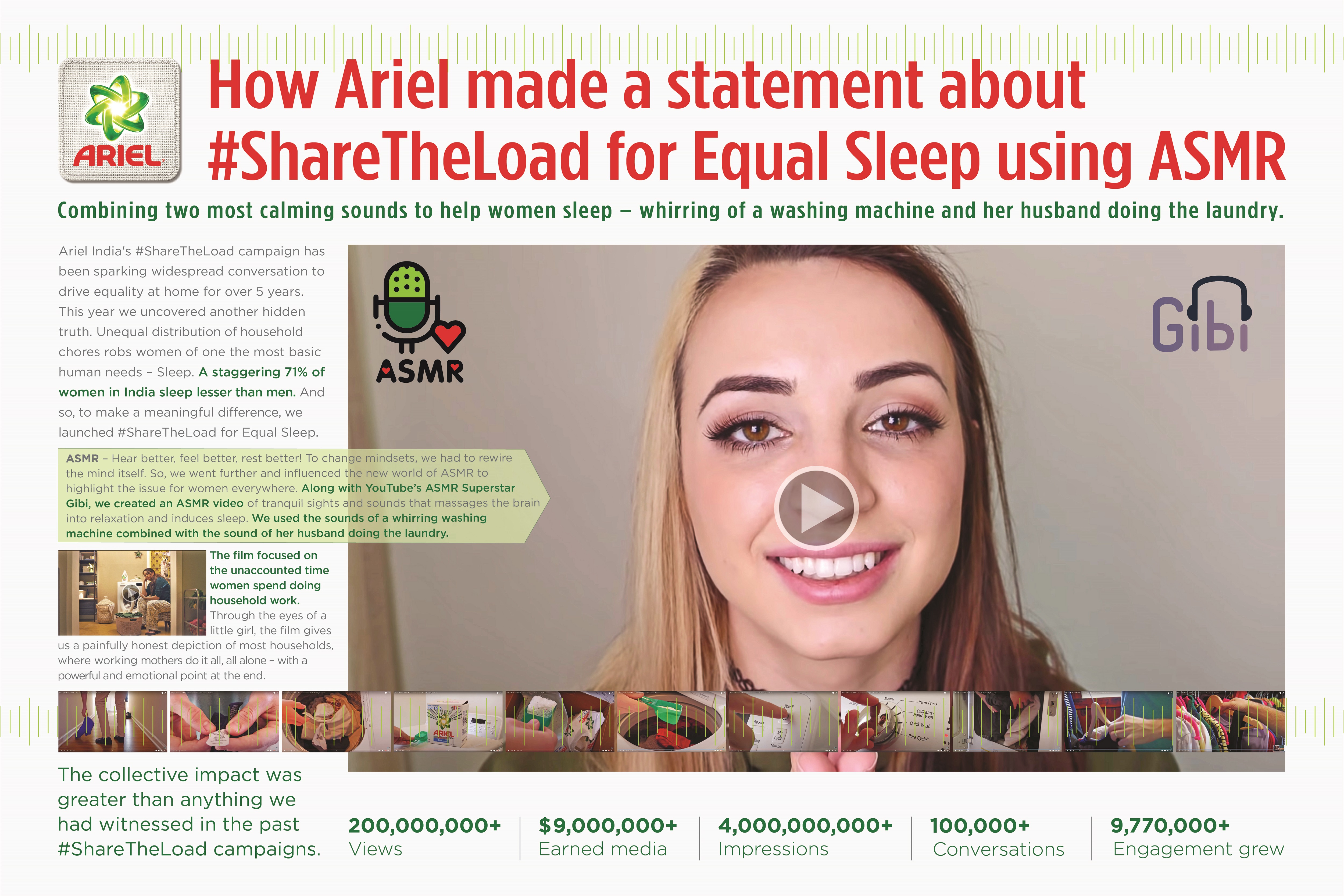 Ariel’s ShareTheLoad movement started five years ago in 2015. In 2020, Ariel collaborated with American ASMR YouTuber and artist GIBI to curate a #ShareTheLoad ASMR. The Ariel #ShareTheLoad ASMR video serves two purposes - men learning how to do laundry, and the therapeutic and soothing sound of the chore when partners take up laundry that can help women unwind, relax and sleep better.