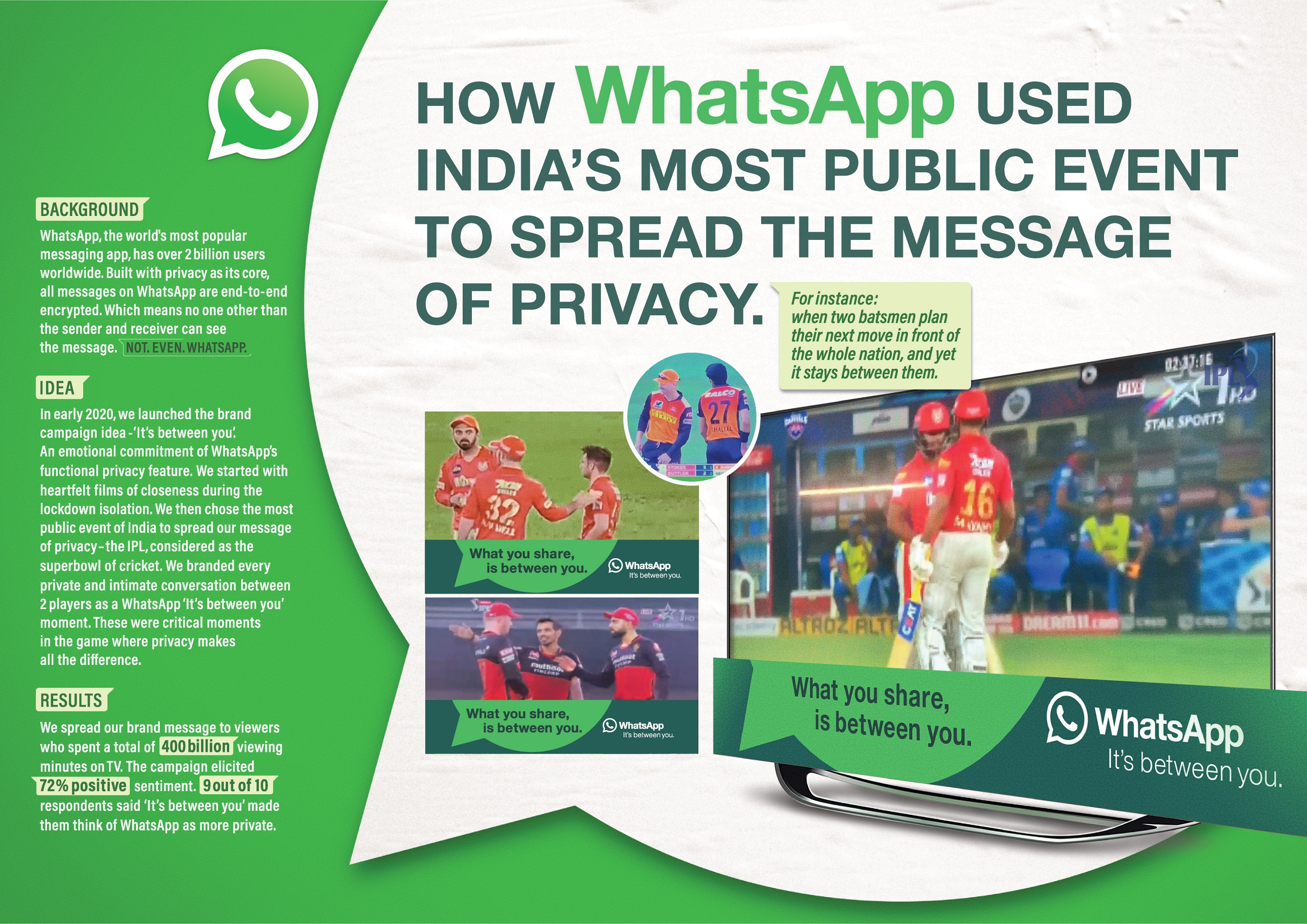 WhatsApp’s mission is to connect the world privately. To bring alive the experience of ‘private moments’ we chose the most viewed event in popular culture in India – IPL. We branded the critical moments in the game where privacy makes all the difference. We branded every private conversation between 2 players as a WhatsApp ‘It’s between you’ moment! For example when two batsmen plan their next move - while millions of people are watching - the exchange stays between them. The IPL games offered many such WhatsApp moments and helped underline the brand’s ‘it’s between you’ commitment.