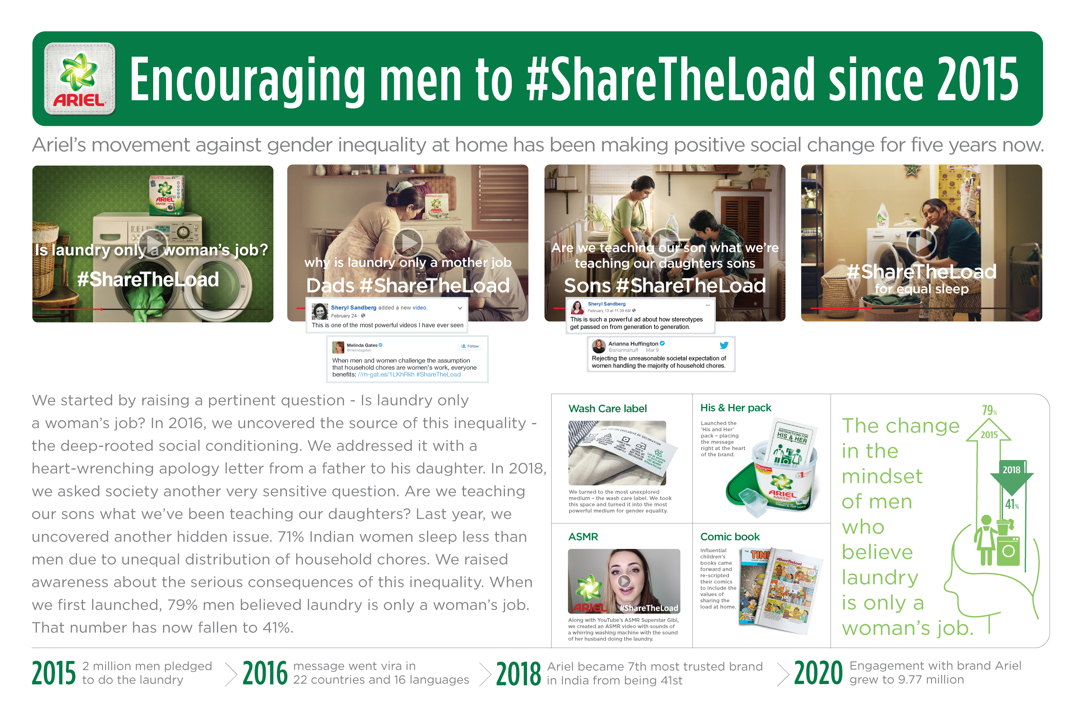 Ariel’s #ShareTheLoad is the longest running campaign against gender inequality at home. The campaign began in 2015 with the question ‘Why is laundry only a woman’s job?’ In 2016, we uncovered the source of this inequality - the deep-rooted social conditioning. We addressed it with a heart-wrenching apology letter from a father to his daughter. The campaign has grown into a movement with some of the world’s most influential leaders joining the action. It has been discussed at the World Economic Forum and UN Women meetings. Year after year, the brand has been challenging deep-rooted conditioning with fresh insights and truths.