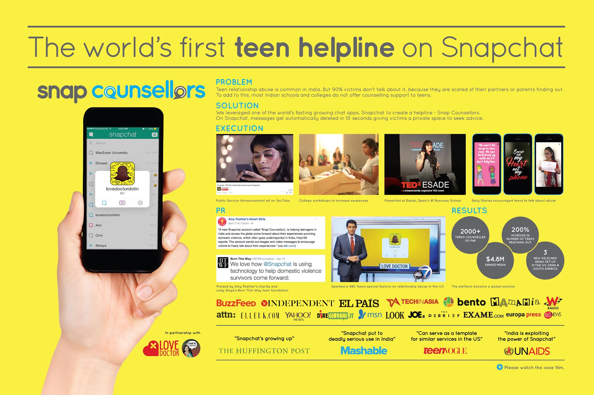 This campaign married the unique attribute of a medium (Snapchat) with a real need among youth. On Snapchat, messages get deleted in 10 seconds, giving victims a discreet platform where they can talk to a counsellor. ‘Snap Counsellors’ was billed as the world’s first teen abuse helpline on Snapchat. It was created with LoveDoctor.in and Chayn India. It has since spawned similar helplines in other countries.