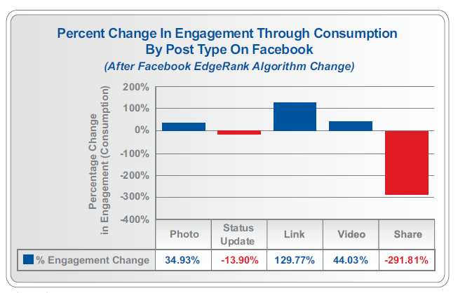 The study found that prior to the EdgeRank algorithm change, the brands studied had an average reach of roughly 16 per cent. Following the change, the percentage of fans who see a brand’s post dropped by 38 per cent. However, the decrease in exposure resulted in almost double the engagement.