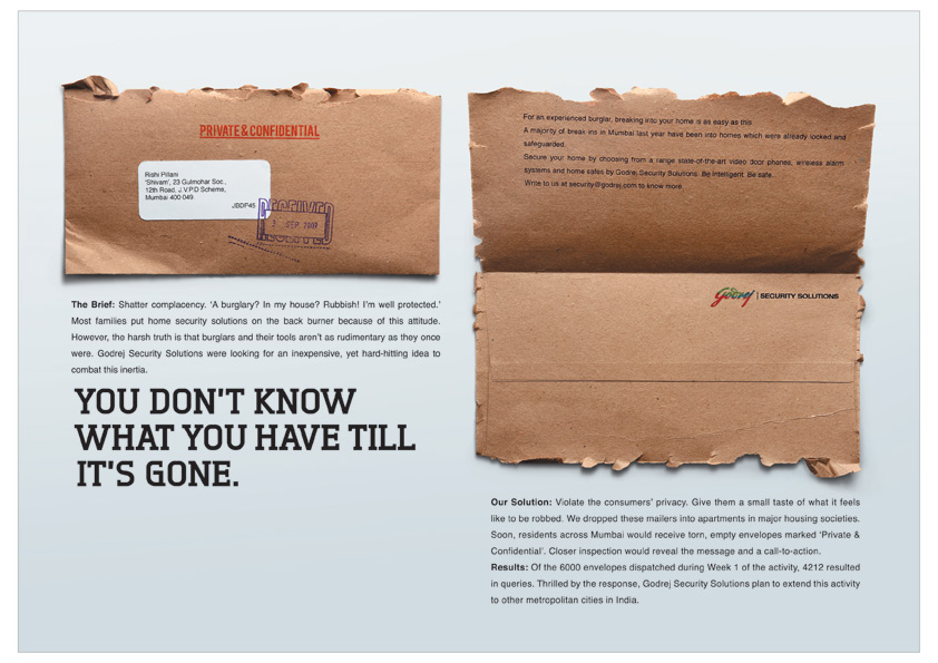 Godrej Security 'Torn Envelope' (2009) Won Silver at AdFest Brief Godrej Security and the proverbial torn envelope. Made its point emphatically and simply.