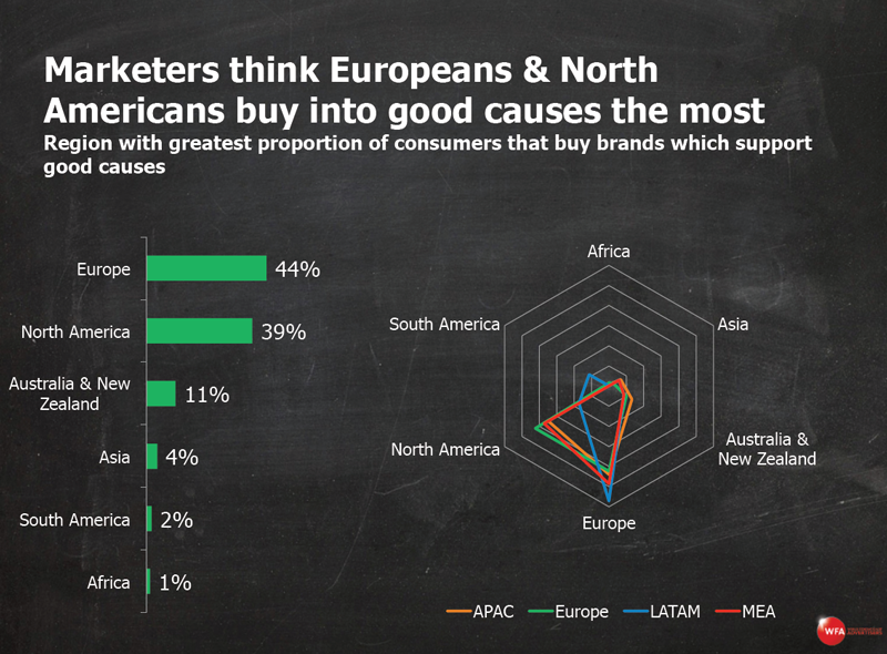 A World Federation of Advertisers study reveals a big disconnect between the actual attitudes of Asia-Pacific consumers about brands that exhibit a higher purpose and CMO perceptions of those attitudes. The WFA surveyed more than 800 marketers in 33 countries. Only 4 per cent named Apac as the region with the greatest proportion of consumers who buy brands that support good causes - a result that flies in the face of findings from Edelman's research on brand purpose (see below).