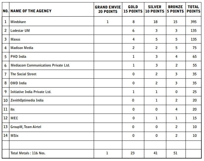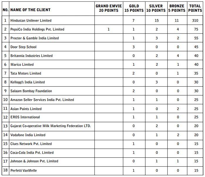 | 5 | Mindshare | Brooke Bond Red Label | 6 Pack Band | Hindustan Unilever Limited | BRONZE |