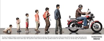To support its latest product on the road, Thunderbird Twinspark 350 cc, Royal Enfield has rolled out a print campaign targeting young adults in metros between 25-35 years.Positioned as India's only cult brand, Royal Enfield's advertising is all about the imagery and the spirit of motorcycling, which is a deliberate move away from product feature-led campaigns that work well for the racy/sporty 100 cc bikes.