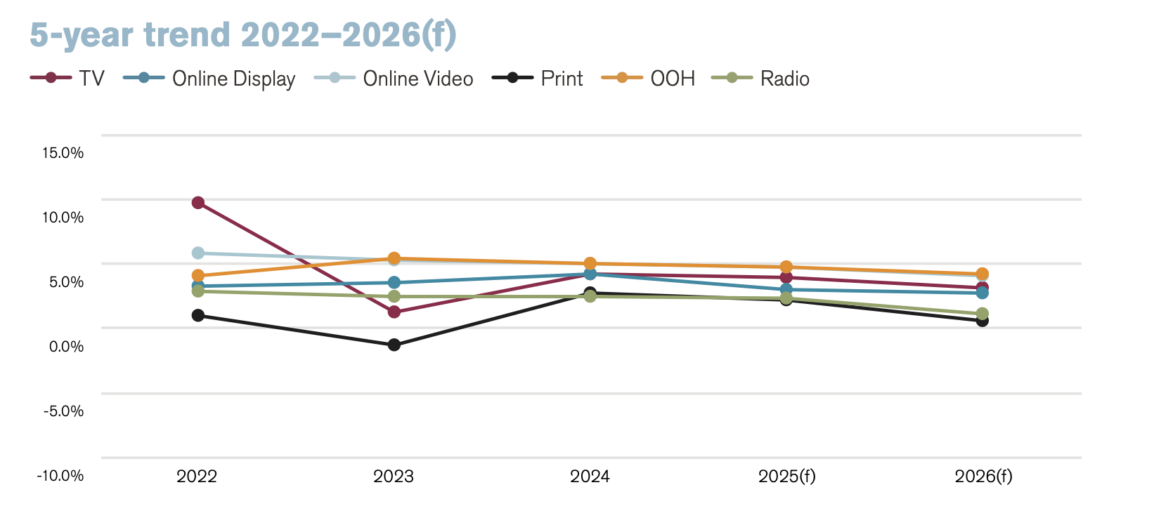 Among other media channels, OOH (4.2%) and TV (3.2%) remain inflationary, while radio (1.1%) and print (0.6%) record the lowest global averages.