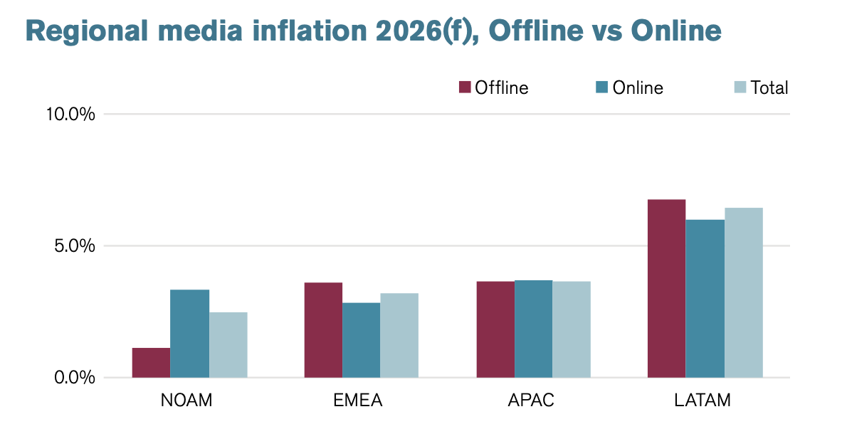 By region, Latin America will experience the highest media inflation at 6.4%, while EMEA (3.2%), APAC (3.7%), and North America (2.5%) will see moderate growth.