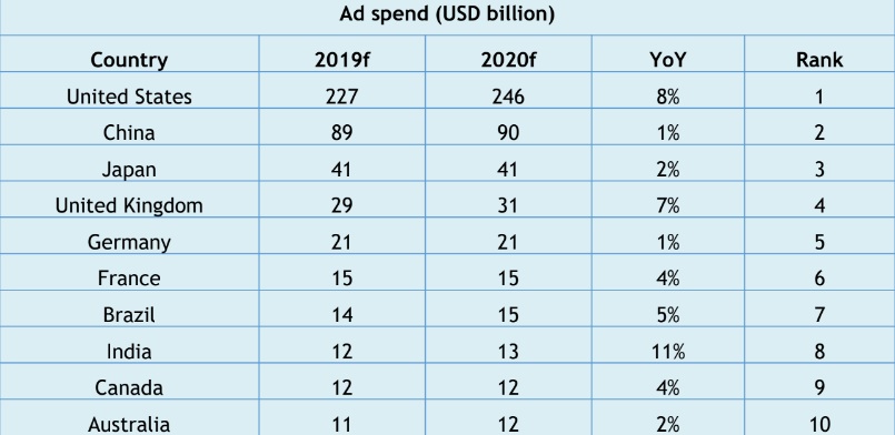 India will continue to be the third-highest contributor to the incremental ad spends, behind the UK and USA. China is at number four.