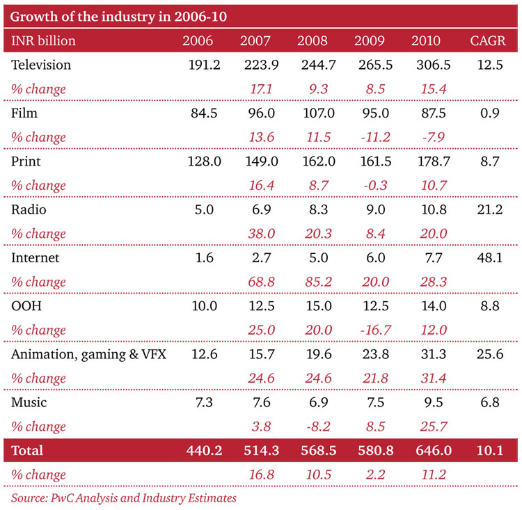 The PwC report estimates that the Indian media and entertainment industry recorded one of the highest growth rates in the world growing at 11.2% in 2010. This was largely due to rebound in consumer spend, advertising spend and most importantly in the media and entertainment spend. The industry grew a little slower than expected largely due to the downturn in the film segment, while all other segments grew as predicted last year.
