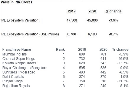According to a report published by Duff & Phelps, A Kroll Business, the value of the Indian Premier League dipped by 3.6% to reach Rs 45,800 crore in 2020.