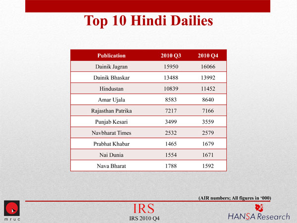 Barring a couple of dailies, all other Hindi dailies have registered a growth in their figures. The segment grew from an AIR of 61,152,000 in 2010 Q3 to 62,694,00 in Q4.