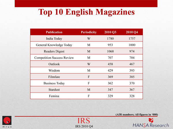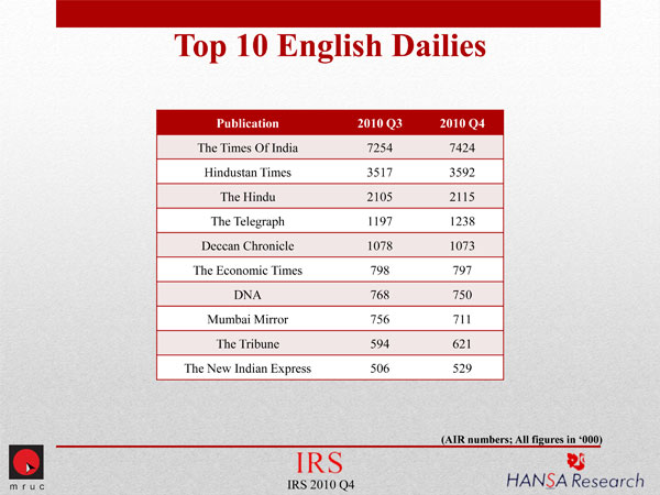The top three publications, all Hindi-language dailies, continue to retain their rankings and have also managed to increase their AIR figures. Continuing its run at the top, Dainik Jagran increased its AIR from 15,950,000 in 2010 Q3 to 16,066,000 in Q4. Dainik Bhaskar and Hindustan managed to add significant readership numbers over the previous quarter and closed Q4 at 13,992,000 and 11,452,000 respectively.