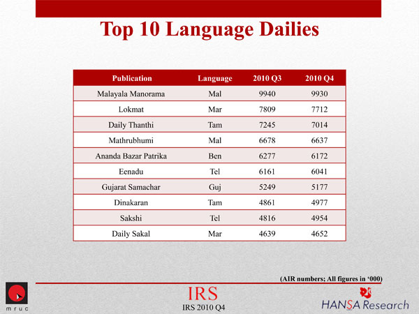 Corrigendum: AIR figures for Malayala Manorama for 2010 Q3 was erroneously reported as 99,40,000 earlier. The revised figures gives the daily a growth in AIR from 99,27,000 in Q3 to 99,30,000 in Q4.