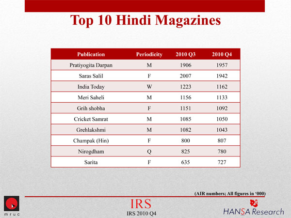 Among the Hindi magazines, apart from leader Pratiyogita Darpan, the following two publications have registered a de-growth in their AIR.