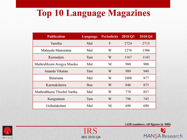 Despite a marginal de-growth, Malayalam language fortnightly magazine Vanitha continues its rein at the top with an AIR of 2,715,000. Hindi monthly Pratiyogita Darpan and Malayalam weekly Malayala Manorama are the only gainers among the Top 10 magazines in this round.