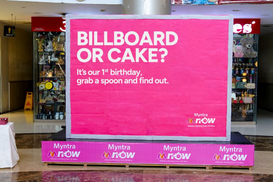 Myntra M-Now’s first-birthday campaign introduced what is described as India’s first fully edible billboard, created by Sociowash. Installed at Maxus Mall in Borivali, the six-foot structure was designed to resemble a conventional billboard while being entirely made of cake. The ambiguity prompted mall visitors to pause, observe and question whether the installation was real, effectively transforming a static display into an interactive moment.