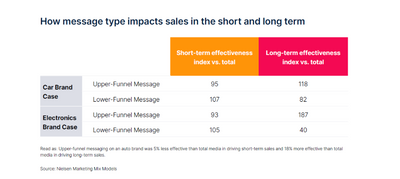 - Upper-funnel messaging delivers slightly lower short-term results, but it delivers meaningful additional value in the long term.