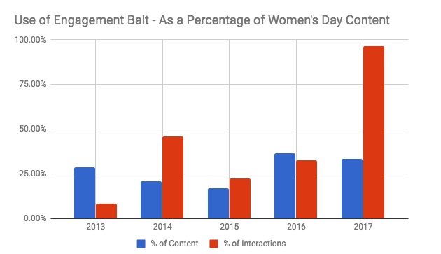Over a fourth of all these posts involved some form of engagement bait, usually as part of contests. Posts that try to artificially boost engagement or reach by asking people to use reactions or comment or share or tag a friend qualify as engagement bait. These brought in, on average, more than 40% of all the interactions these personal care brands received on their Women’s Day content.