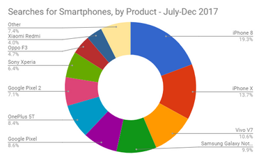 Among smartphones, iPhone 8 led the pack as the most popular searched for brand (19.26%), followed by iPhone X (13.72%), Vivo V7 (10.60%), Samsung Galaxy Note 8 (9.81%) and Google Pixel (8.58%).