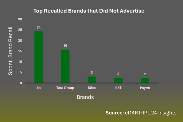 Jio, Tata Group, Slice, BKT, and Paytm emerged as the most recalled brands of IPL 2024 despite not investing in conventional advertising modes, according to the latest, eDART-IPL24 report released by Crisp Insight and Kadence International.