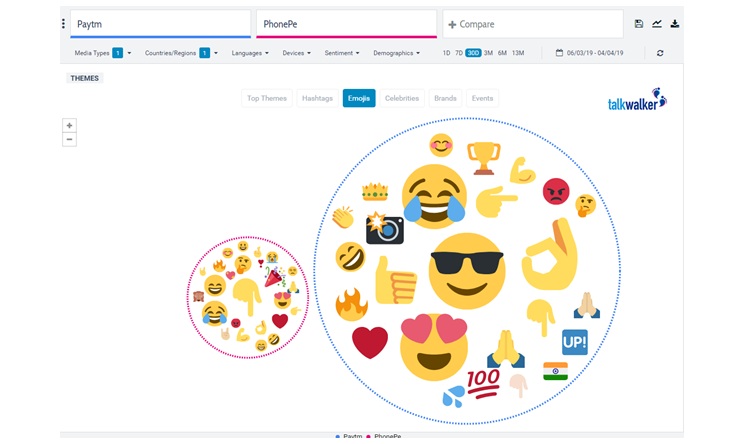 Emojis: Emotions always run high when money is involved. So obviously we couldn’t do a proper analysis of the brands without comparing emojis. Of course, the emoji cloud for PayTm is much larger, but PhonePe seems to be emerging as well. It’s interesting to note that the most prominent emoji for PhonePe is a hand with the forefinger pointing downwards – generally this doesn’t give off a very positive vibe. PayTm though seems to be getting ahead of PhonePe with their emoji game as well.
