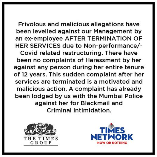 The Times Network has stated that these allegations are frivolous and come as the past employee's services were terminated due to non-performance and Covid-related restructuring.