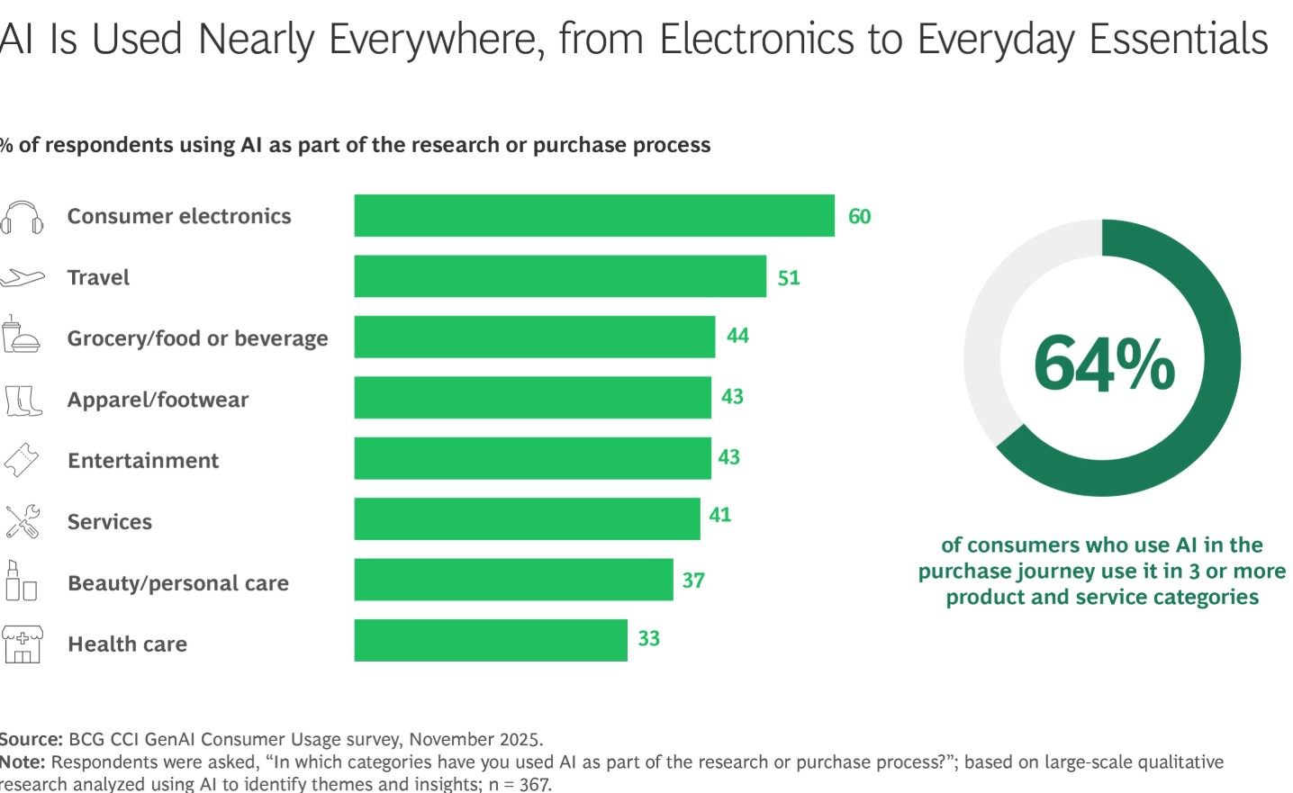 Shoppers used Gen AI across categories—not just special, big-ticket items, such as consumer electronics, but also routine, everyday purchases, like groceries.