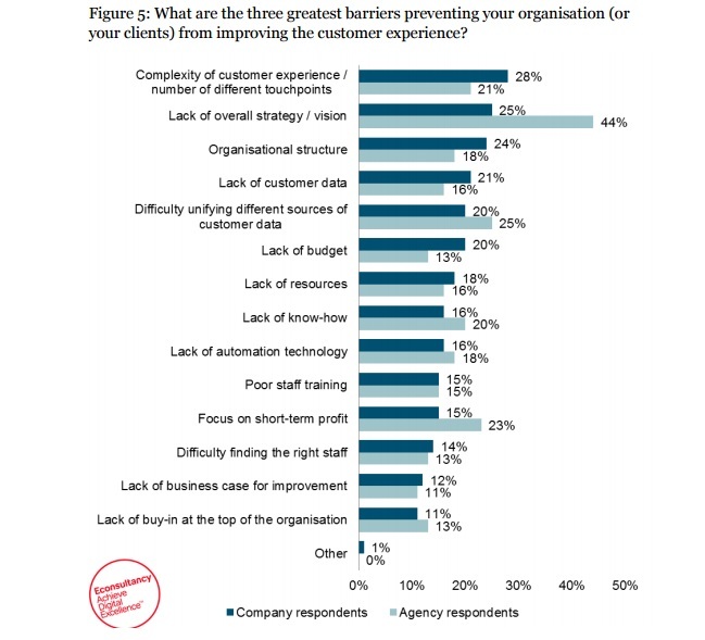 The lack of an overall strategy or vision is also proving to be a significant obstacle for a quarter of company respondents, and 44 per cent of agency-side respondents (the largest majority) support this view. A further 24 per cent of companies believe organisational structure is a problem, suggesting that department silos are preventing businesses from adopting a customer-centric approach and mentality.