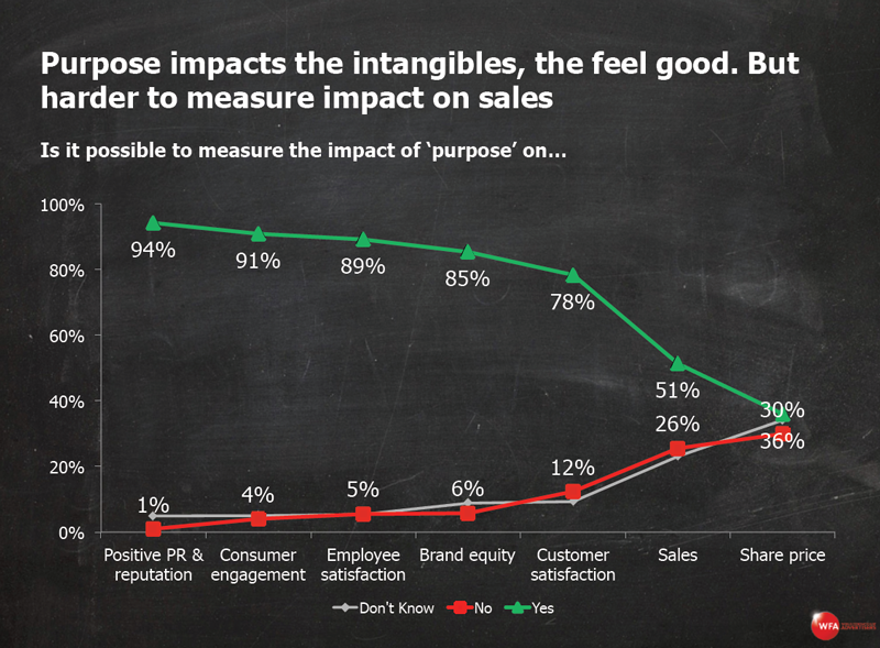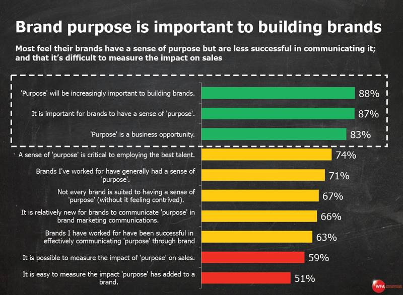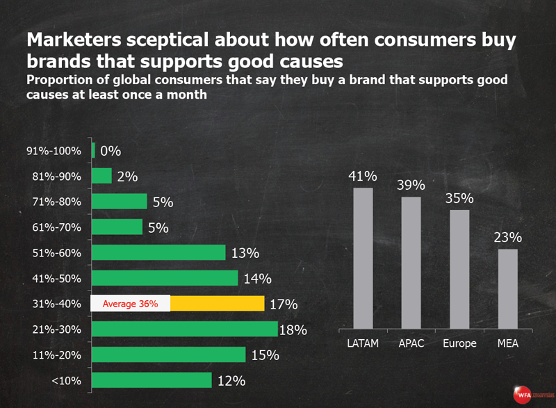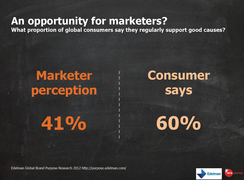 A World Federation of Advertisers study reveals a big disconnect between the actual attitudes of Asia-Pacific consumers about brands that exhibit a higher purpose and CMO perceptions of those attitudes. The WFA surveyed more than 800 marketers in 33 countries. Only 4 per cent named Apac as the region with the greatest proportion of consumers who buy brands that support good causes - a result that flies in the face of findings from Edelman's research on brand purpose (see below).