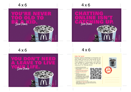 For the in-store activity, there will be three post cards given to customers which will talk about the 'slow down' philosophy. The customer would then be asked to pass on the cards to three other people who they think have been working too hard and need to slow down.